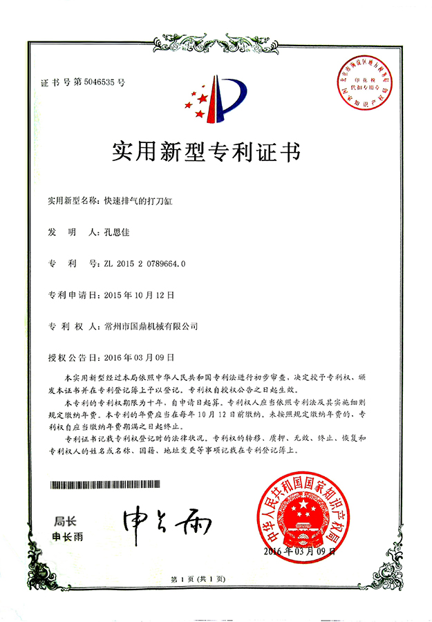 《快速排氣的打刀缸》專(zhuān)利證書(shū)